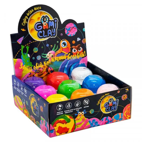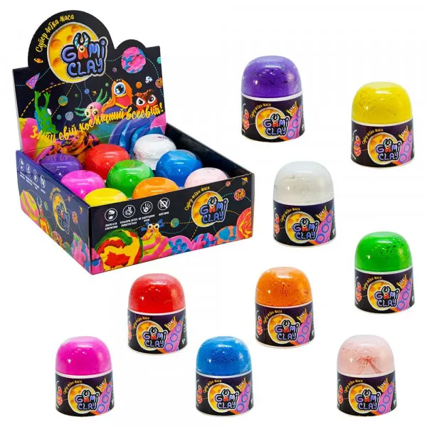Смішні звірята, фігурки героїв мультиків і все що дозволить виліпити фантазія малюка, перетворяться на іграшки за допомогою самозастигаючої маси «Gumi clay». Можливість своїми руками створити фігурку улюбленого героя допоможе розвинути творчі здібності малюка та допоможе в інтелектуальному розвитку. Після того, як іграшка готова, маса застигає протягом 30 хвилин, перетворюючись на легкий, але міцний виріб яскравих кольорів. Маса для ліплення дуже пластична, різні кольори легко змішуються, вона не забруднює руки і може набувати будь-якої форми. Має яскраві кольори та абсолютно безпечна. Склад тесту: вода, наповнювач, фарбник.