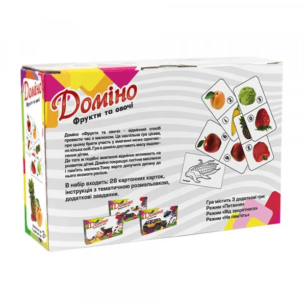«Доміно Фрукти та овочі» – популярна настільна гра в новому навчальному форматі. Тепер ігри стали не лише веселими, а й корисними. Яскраві картки познайомлять малюка з фруктами та овочами, покращать уважність та посидючість. Також у наборі є додаткові завдання, які допоможуть закріпити отримані знання!