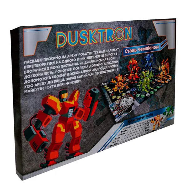 Арена з бойовими роботами чекає на малюка в настільній грі «Dusktron» (Strateg 30468) і пригоди у фантастичному світі майбутнього захоплять його з перших кроків. Гра для компанії до 4 осіб - зможе зацікавити не тільки дітей, а й дорослих, дасть можливість захоплююче провести час всій родині, при цьому розвинути уважність, виявити свої знання та розважитися. Відповідно до очок, що випали на кубику, гравці пересувають фішку на ігровому полі, на якому є багато завдань та підказок, які роблять гру ще цікавішою. Ігрове поле прикрашене барвистими малюнками із зображеннями персонажів гри та їх супротивників. У процесі гри необхідно виконати завдання, подолати перешкоди, розгадати загадки та дати правильні відповіді. Той, хто виконав завдання, може пересунути свою фішку. Перемагає той, хто першим приведе свого робота до фінішу! Правила прості, але гра захопить учасників із першої партії. Додатковий бонус – у комплекті є постер із барвистим зображенням персонажів-роботів, лінійка та закладка, виконані у стилістиці гри. Розмір ігрового поля 42 х 60 см. Мова українська.