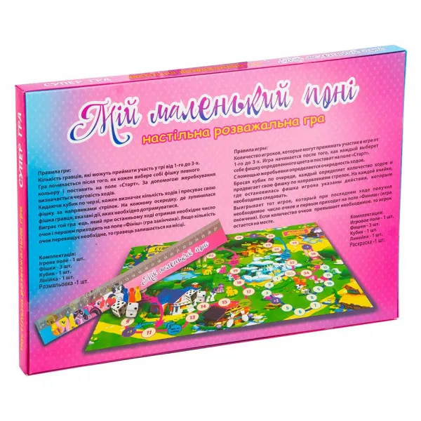 «Мій маленький поні» - настільна гра від компанії Strateg, яка одразу ж захопить маленьких непосед своїм насиченим сюжетом та незвичайним дизайном. Головною особливістю представленої гри є прості правила, які легко запам'ятати один раз, прочитавши перед стартом. Проте учасникам доведеться подолати чимало випробувань на своєму шляху до заповітної позначки «фініш».