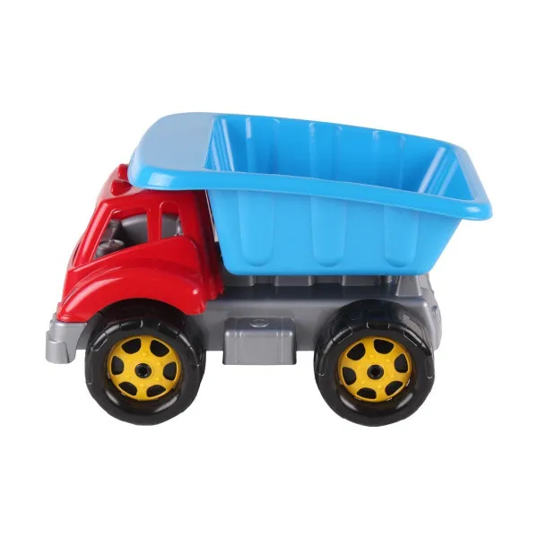 Велика, міцна пластикова іграшка. Стильний самоскид сучасного дизайну. Стійкий до дії несприятливих погодних чинників - дощу, снігу, низьких температур. Машинка функціональна : кузов самоскида піднімається і перевертається назад. Можна грати вдома і брати з собою на прогулянку. Спереду на бампері є отвір для кріплення шнурка.