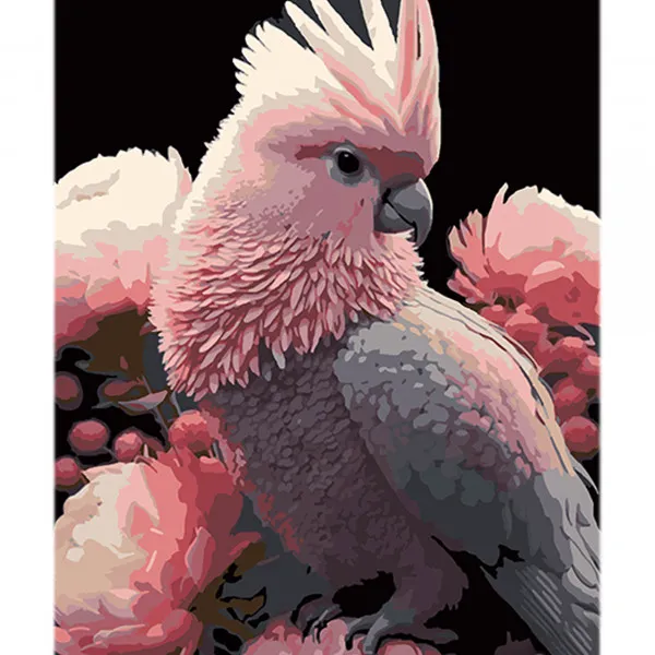Картина за номерами Strateg Какаду у рожевому вбранні на чорному фоні розміром 40х50 см (AH1109)