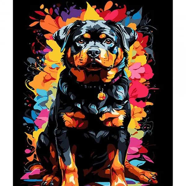 Картина за номерами Strateg ПРЕМІУМ Ротвейлер на фоні кольорових квітів на чорному фоні розміром 30х40 см (FH-10)