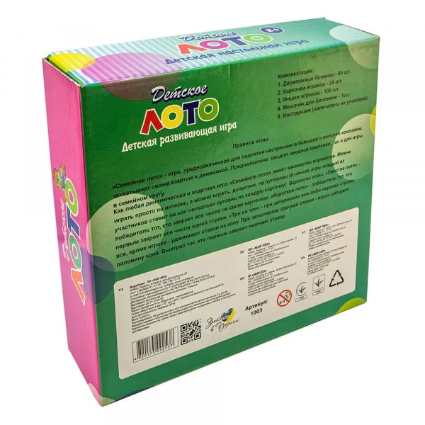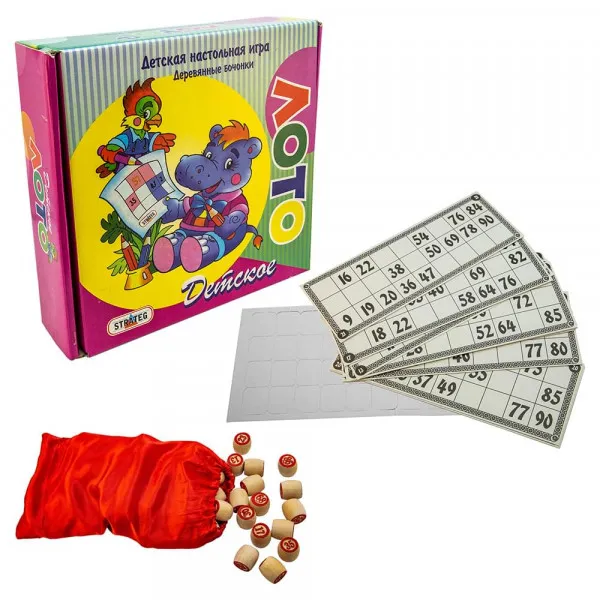 Лото - найдавніша гра, в яку раніше грали тільки знатні особи і швидко набрала величезну популярність. У наш час – це універсальна настільна гра, в яку із задоволенням грають усією родиною, дорослі та діти, вдома чи на природі. Велику користь така гра приносить розвитку дитини. У родинному колі дитина намагається грати нарівні з дорослими. Така обстановка сприяє виробленню швидкої реакції та кмітливості, розвивається пам'ять. У процесі гри активно задіяні всі розумові процеси, малюк використовує раніше набуті комунікативні навички та отримує нові. Лото «Дитяче» (Strateg 343) створено у найкращих традиціях цієї гри. У комплекті 24 ігрові картки, дерев'яні барильця з цифрами у мішечку, гральні фішки. Залежно від ваших переваг ви можете вибрати будь-який з варіантів гри – заповнення однієї картки, заповнення двох карток, заповнення одного рядка тощо. Також дійові особи визначають формат гри – на інтерес або ж із призовим фондом, що, звичайно ж, додасть грі азарту та зробить її більш насиченою. Лото знаходиться в барвистій коробці і відмінно підійде як подарунок на будь-яке свято.