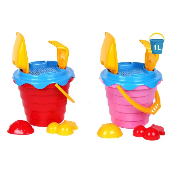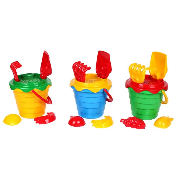 Яскраве ребристе відерко із зручною ручкою, лопатка, грабельки, 2 формочки та сито.