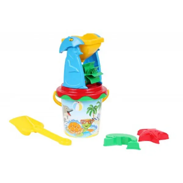 Млинок у формі пінгвіна з парасолею. Відерком з малюнком, нанесеним за технологією IML. Формочки для піску та лопатка.
