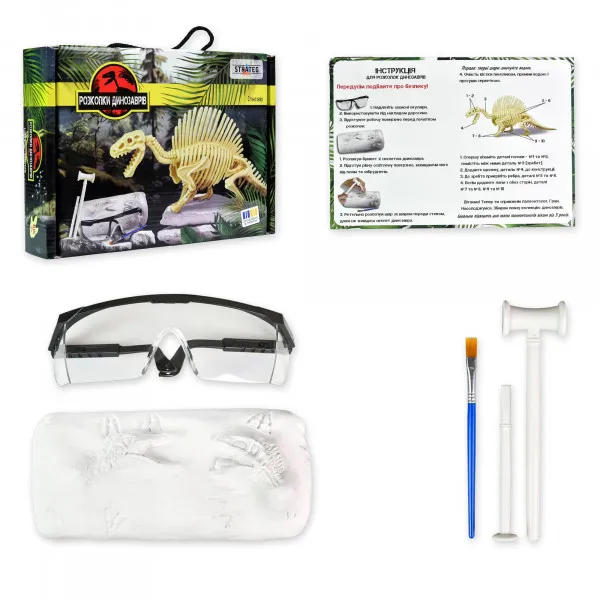 Набір для творчості "Розкопки динозавра. Спінозавр" — цікавий та захопливий набір для допитливих дослідників. У коробці ви знайдете необхідні інструменти, окуляри для захисту, гіпсовий брикет зі скелетом динозавра та пояснення, як саме діяти. Може здатися, що археологи вже знайшли всі скам'янілості, але скажемо по секрету, що ми дещо зберегли. Нумо до нових відкриттів!