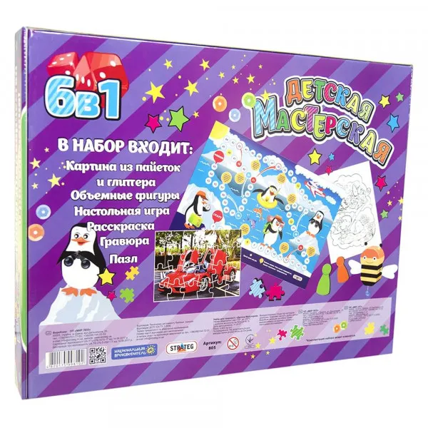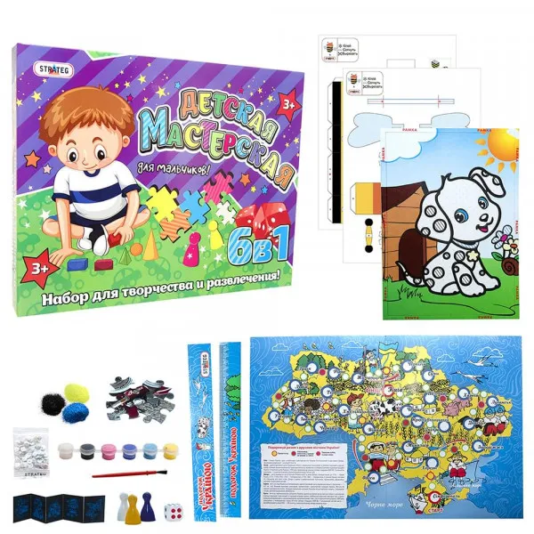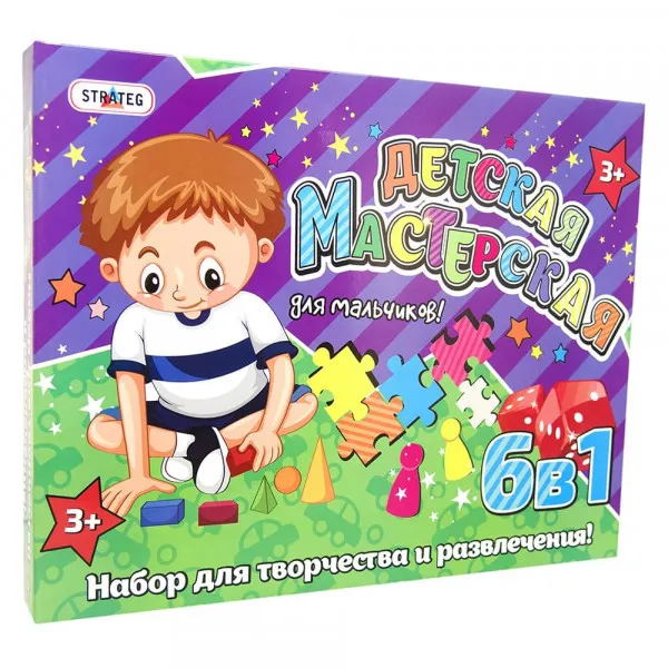 Якщо ви хочете не тільки зайняти дитину, а й по-справжньому здивувати малюка, то набір для творчості та розваг російською мовою «Дитяча майстерня для дівчаток» (Strateg 805) створений саме для таких цілей. Набір включає найулюбленіші розваги дітлахів, кожен з предметів несе в собі не тільки ігрову, а й функцію, що розвиває. Такий набір розвиває величезну кількість навичок, необхідних малюкам для повноцінного та щасливого дорослого життя. Головоломки розвивають аналітичний розум, логіку, вміння діяти послідовно та зіставляти деталі. Малювання дає можливість виявити творчий бік своєї особистості. Формується колірне сприйняття, образне та абстрактне мислення, вміння поєднувати різні кольори та відтінки. Для виконання гравюри, яка запропонована в комплекті, необхідна точність, уважність та посидючість, а для отримання хорошого результату дитині потрібно виявити велику акуратність та терпіння. Такий набір надовго захопить компанію малюків, адже у барвистій коробці кожен знайде заняття собі до душі. На вибір малюкам запропоновано - зіграти в настільну гру, оживити яскравими фарбами запропоноване розмальовку, зробити об'ємну фігуру з картону, створити блискучу картину з паєток і гліттера, а також скласти пазл або гравюрою.