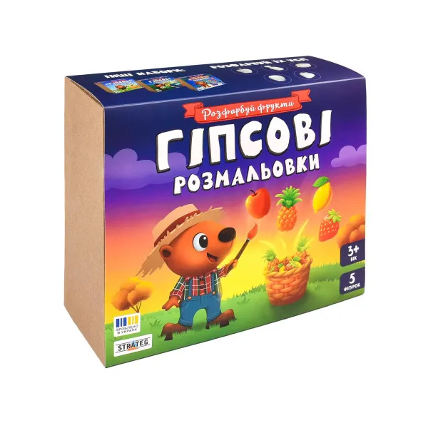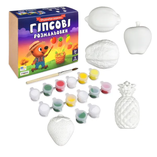 В набор входят 5 гипсовых фигурок в виде самых сочных фруктов и ягод: яблоки, груши, лимона, клубники и ананаса. Задача проста, но увлекательна: раскрасить их яркими красками и кисточкой, которые есть в комплекте, и превратить обычные гипсовые заготовки в настоящие художественные шедевры.
