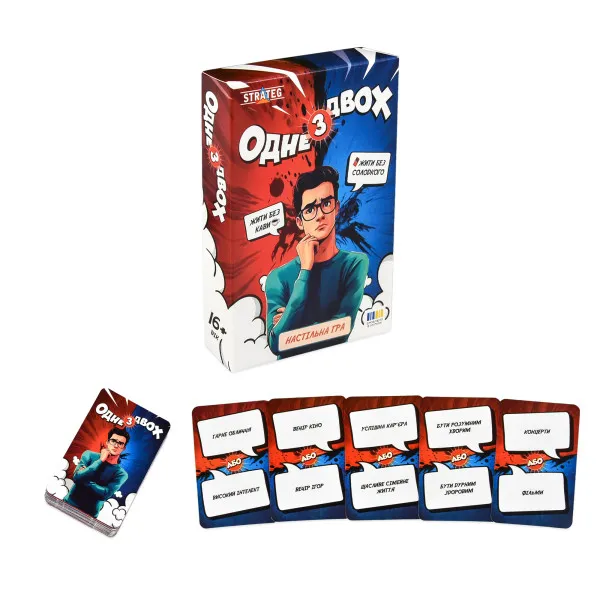«Одне з двох» — настільна гра для компанії, щоб весело провести час і краще пізнати одне одного. На картках — два варіанти, обрати можна лише один.