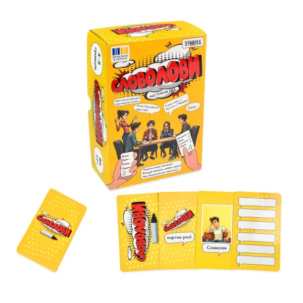 «Словолови» – настільна гра для компанії на пояснення слів. Вигадник загадує слово, словолови намагаються передбачити, які слова можуть прозвучати під час пояснення, пояснювач тлумачить, а відгадник шукає відповідь. Підходить для вечірок, тімбілдингів і сімейного дозвілля.