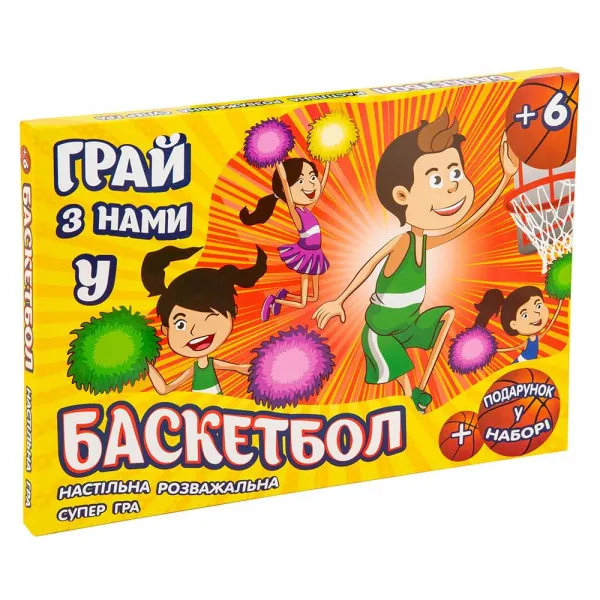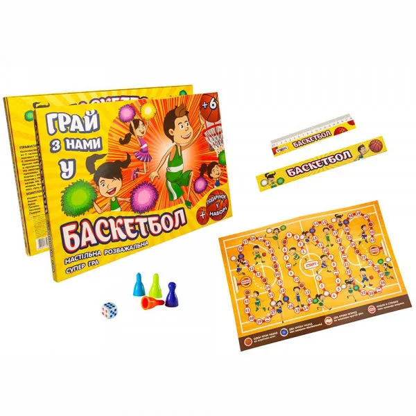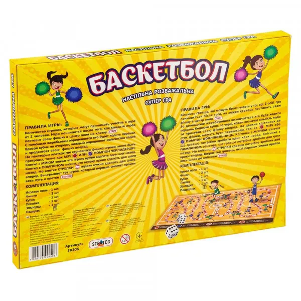 Захоплюючий світ спортивних змагань чекає на дитину в настільній грі «Баскетбол» (Strateg 30206). Грати можна у компанії від 2 до 4 осіб. Зможе зацікавити не лише дітей, а й дорослих, дасть можливість захоплююче провести час всій родині, при цьому розвинути уважність та розважитись. Веселий сміх при цьому гарантовано! На початку гри всі учасники встановлюють фішки в центрі ігрового поля і пересувають їх відповідно до кількості очок, що випали на кубику. Для цього необхідно вибрати напрямок руху. На ігровому полі, що зображує баскетбольний майданчик, є багато перешкод та підказок, які роблять гру ще цікавішою. Переможе той, хто першим закине м'яч у кошик супротивника. Правила прості, але гра захопить учасників із першої партії. Перед початком гри рекомендується вивчити інструкцію. Як додатковий бонус у комплекті є лінійка та закладка, прикрашені в стилістиці гри. Мова українська.