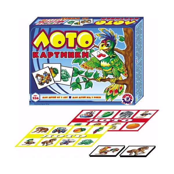 Настольная игра по правилам классического лото с картинками, на которых изображены различные рисунки. Хорошая подготовительная игра перед школой. Все составляющие игры изготовлены из плотного картона, поэтому не будут деформироваться в ходе игры. Яркие и красочные картинки обязательно заинтересуют малышей.