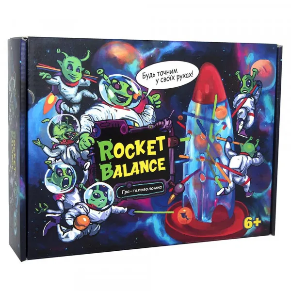 Продумати свої дії під час будівництва міжгалактичного зорельоту необхідно в грі-головоломці «Рокет Баланс». Щоб допомогти прибульцям зібрати та запустити космічний корабель необхідно з'єднати між собою складові та завантажити його паливом. Спеціальні напрямні допоможуть розмістити паливні кульки у корпусі. При вийманні стрижнів кульки не повинні впасти. Така гра сприяє розвитку особистості та характеру малюка – посидючості, акуратності та наполегливості, а також розвитку колірного сприйняття, координації, уяви та логічного мислення, формі предметів та вмінню аналізувати. Всі деталі виконані з екологічно чистих елементів різних кольорів та упаковані в коробку з яскравими та забавними малюнками.