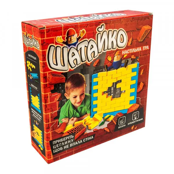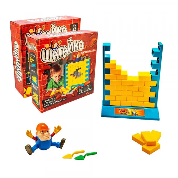 Весела розвага для компанії - гра "Шатайко" (Strateg 30305) дасть можливість захоплююче провести час і при цьому розвинути пам'ять, уважність, почуття об'єму та спритність. Є різновидом відомої гри Дженга або падаюча вежа. Для початку гри необхідно побудувати стіну з будівельних блоків з використанням 44 однакових елементів, встановлених на основу, та закріплених за допомогою двох опор. І додати веселощів! На стіні розміщена кумедна фігурка будівельника, що коливається. Правила гри прості – за допомогою іграшкової будівельної кельми перший учасник повинен акуратно витягти одну з цеглинок, після чого передати хід. Програє той учасник, після якого фігурка впаде. Правила прості, але гра захопить учасників із першої партії. Мова українська.